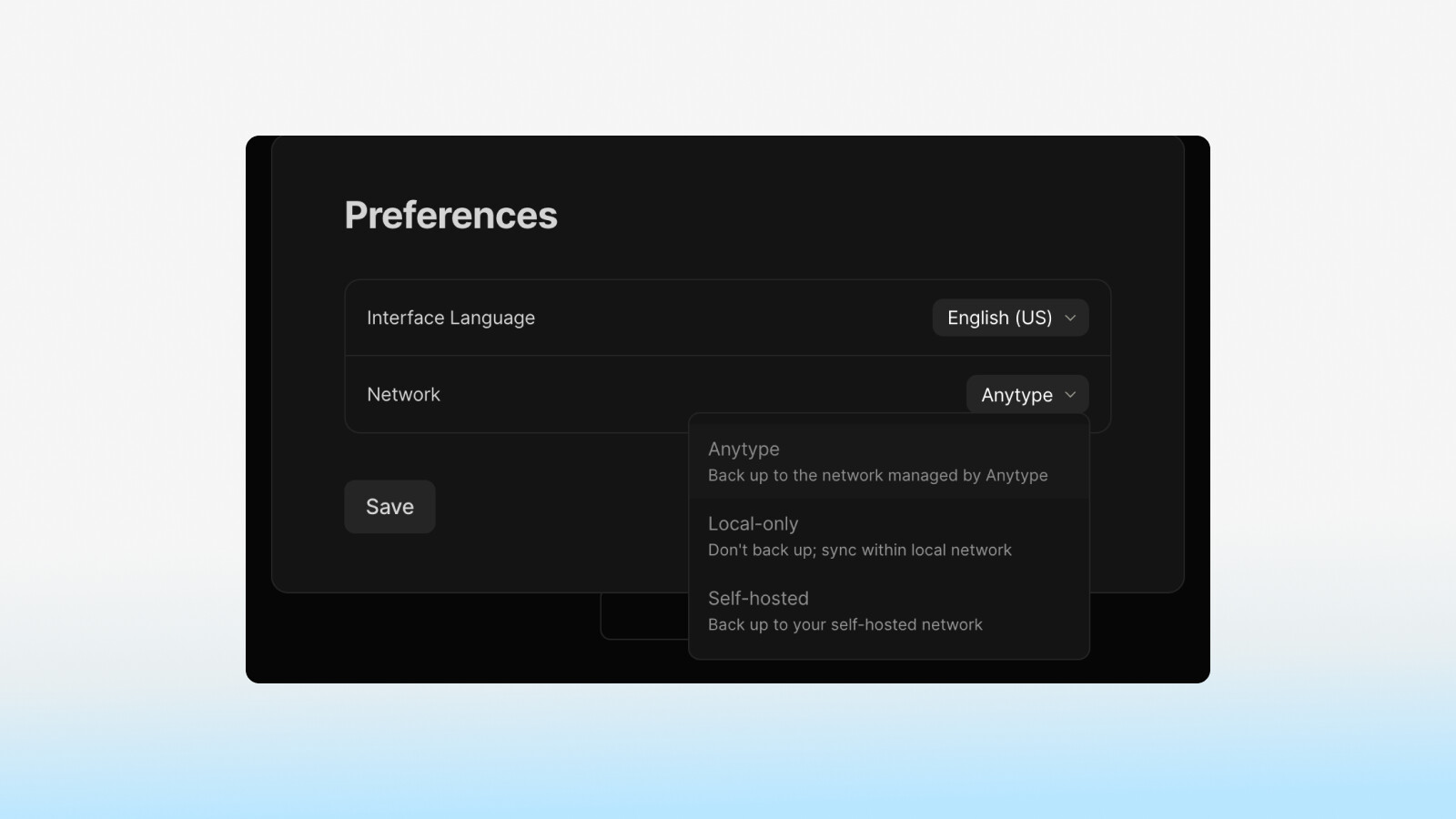 要将你的空间和数据备份到自托管网络，你需要拥有一个网络配置。如果你还没有运行自己的网络，请看这个 [指南](https://tech.anytype.io/how-to/self-hosting)。