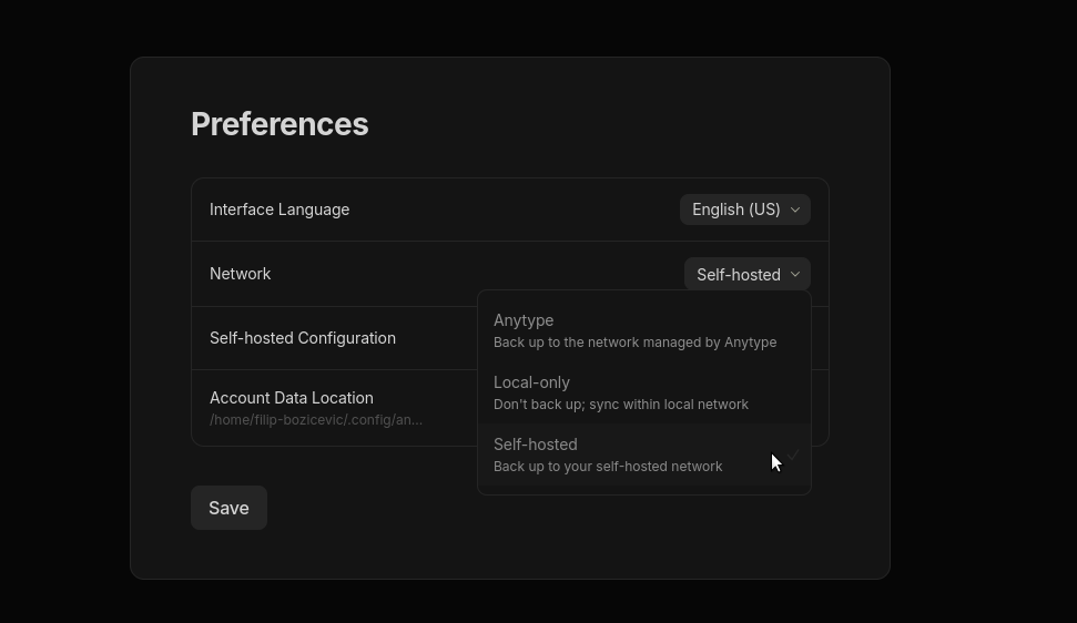 Мы настоятельно рекомендуем использовать отдельные учетные записи для каждой сети. Если у вас уже есть учетная запись в сети Anytype и вы хотите переключиться на сеть с самостоятельным хостингом, экспортируйте все ваши пространства и импортируйте их в новую учетную запись после переключения режима сети.