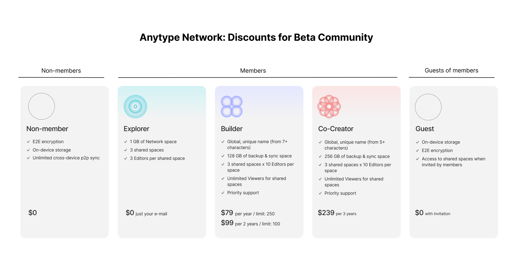 Пользователи с самостоятельным хостингом могут самостоятельно управлять лимитами Просмотрщиков/Редакторов, которых они приглашают в свои пространства. Те, кто хочет приобрести имя в системе имен Anytype или получить приоритетную поддержку, могут приобрести членство по той же цене, что и другие бета-тестеры.