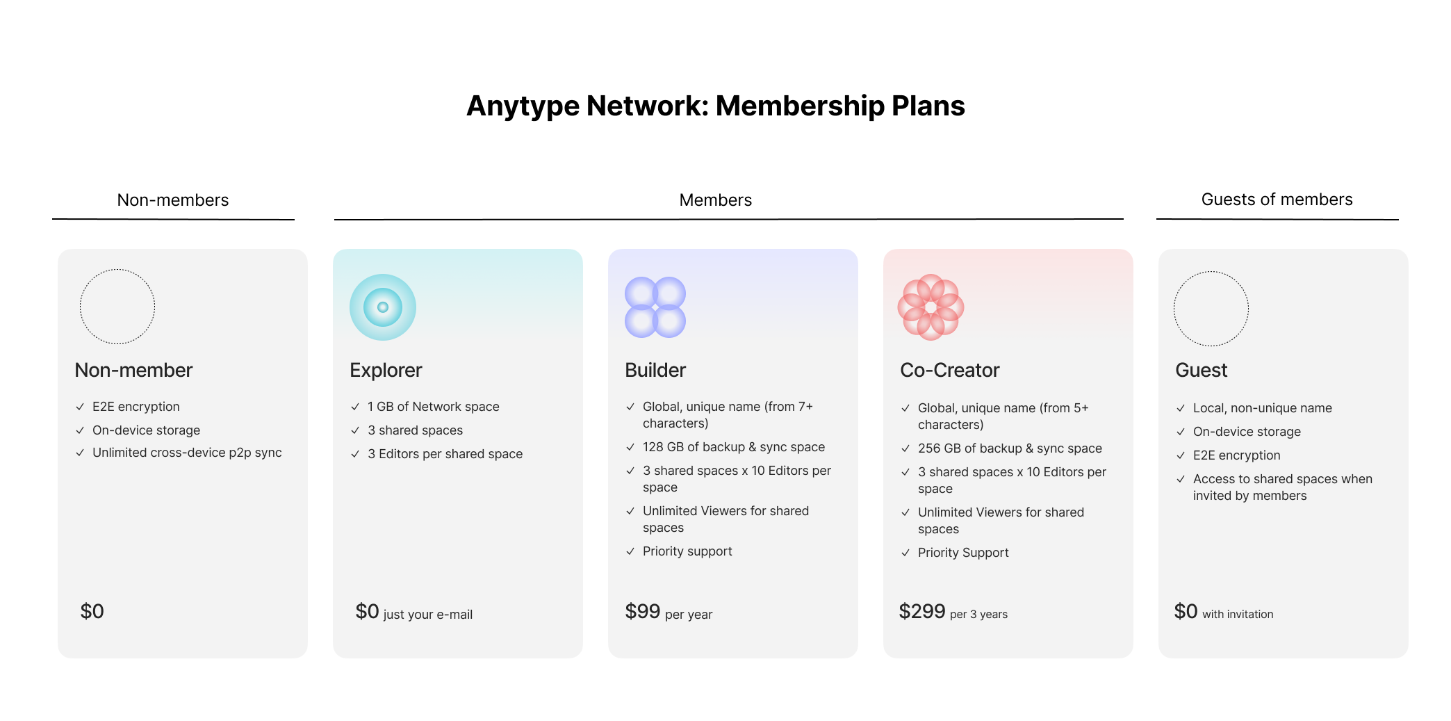 После запуска программ членства все пользователи Anytype будут относиться к одной из следующих категорий: